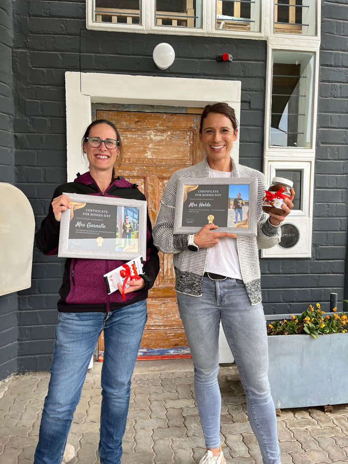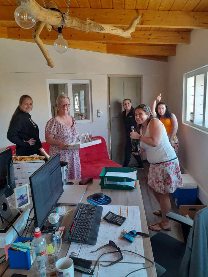 Marion wurde am Nabel der Welt in Outjo geborgen und hat seit 2017 bei uns den Posten der “Finanzministerin”. Marion ist immer auf Zack! Mit einem flotten Spruch auf den Lippen und viel Tempo düst sie täglich durch das Büro und hält gemeinsam mit Birgit die Hand auf die Finanzen der Firma. Sie kennt kein Erbarmen, wenn es um die Richtigkeit der Zahlen geht. Ihr Mann Olaf versorgt das Team täglich mit dem notwendigen Frühstück vom Bäcker und hilft im Büro bei allem, was tagtäglich an Behördengängen und Erledigungen anliegt.